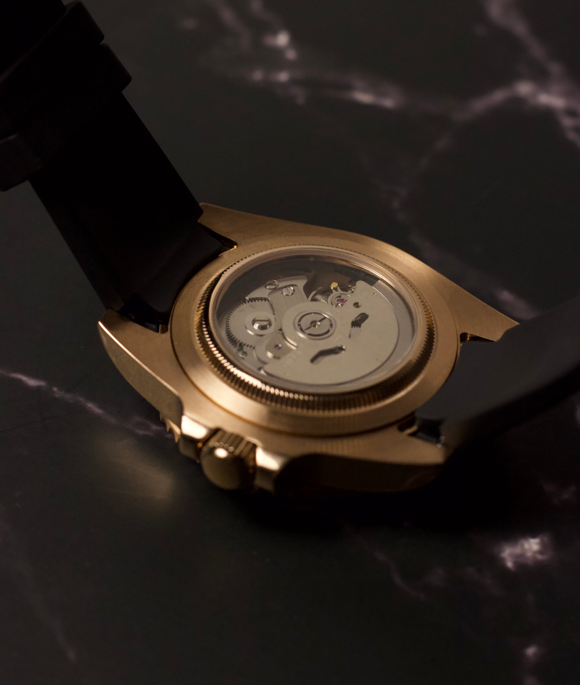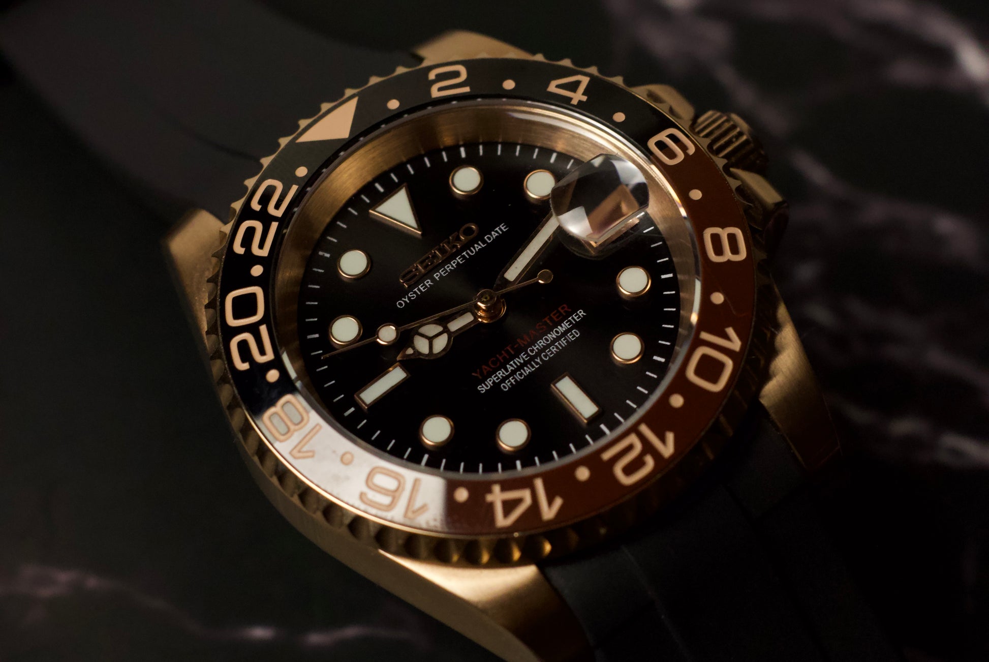 Sleek and sophisticated, the Rose Gold Yacht Master features a reliable NH35 automatic movement visible through a clear caseback. Its black dial with Mercedes hands, rose gold case, and black band create a bold, modern look with classic appeal.